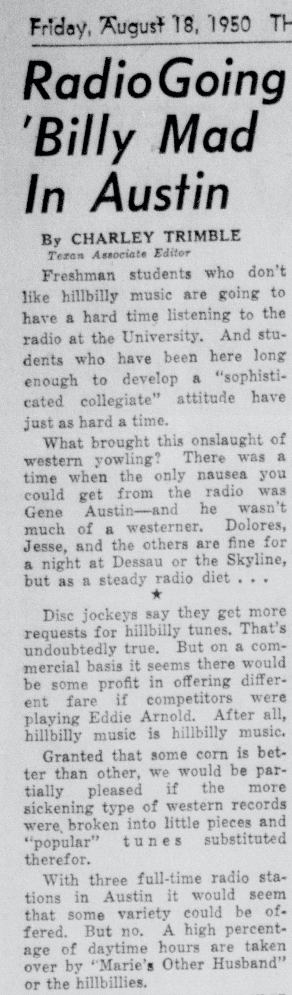 - Charley Trimble, “Radio Going ’Billy Mad in Austin,” The Daily Texan (August 18, 1950). ⏎