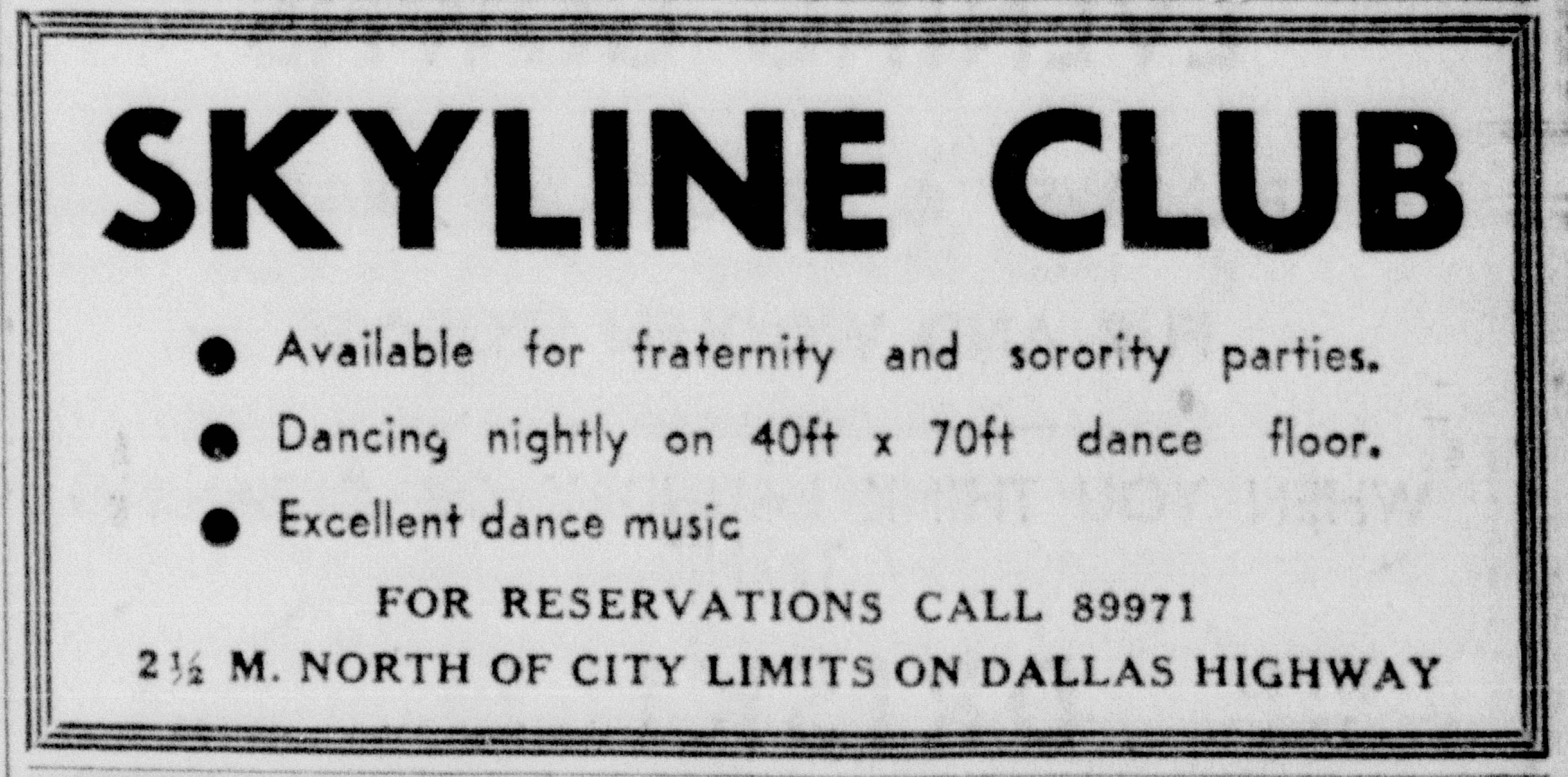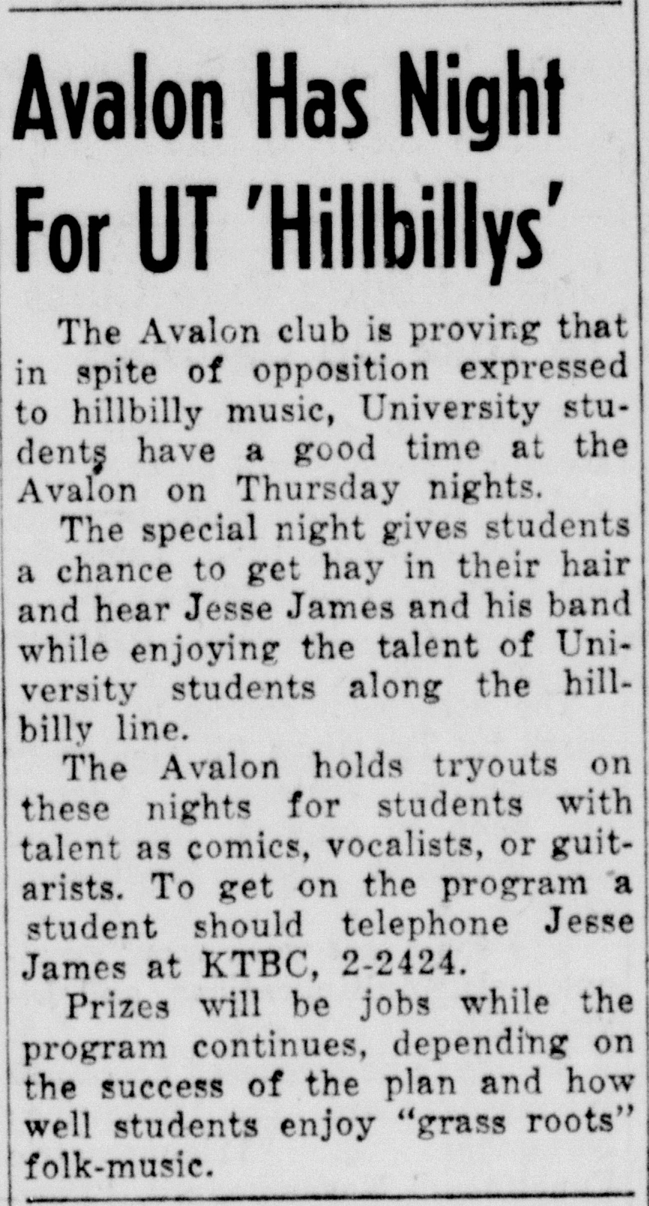 - “Avalon has Night for UT ‘Hillbillys’,” The Daily Texan (October 27, 1948). ⏎