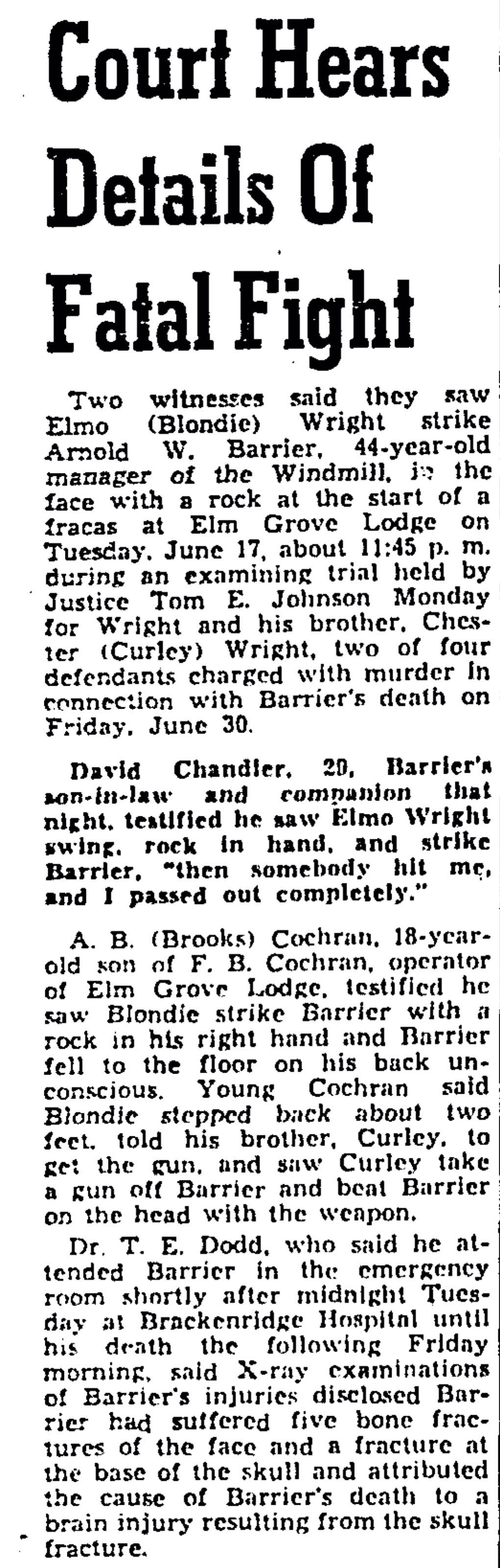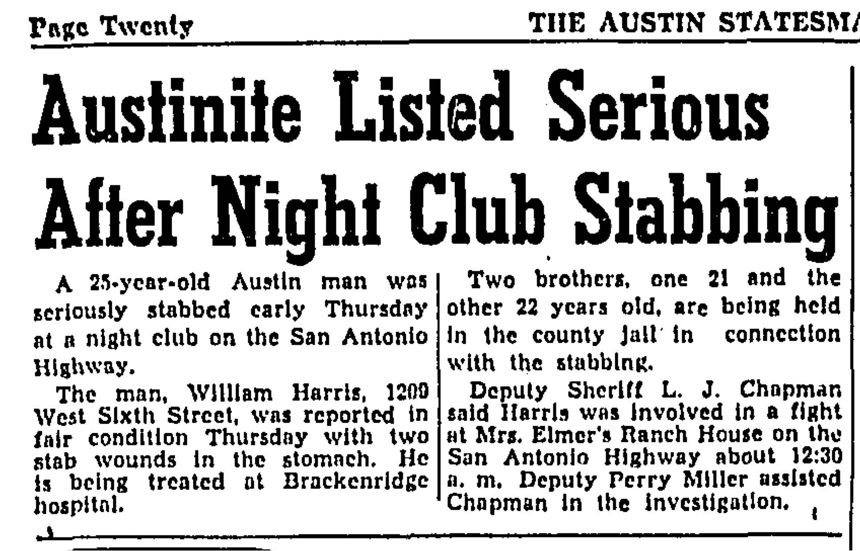 In a recent interview with the author, steel guitarist Wayne Wood said that brawls were ”commonplace” at Honky Tonks in Austin in the early to mid-1950s: ”some of those places I played, you’d see the fights pretty regular.” He recalled a terrifying fight he saw while playing a gig: