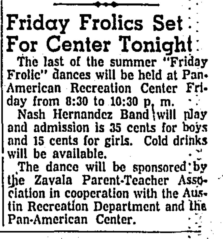 Like the Pan-American Center or Zaragosa Park, the Nash Hernandez orchestra was a binding cultural institution for these mid-century Mexican American neighborhoods in East Austin. It was a community band, a compliment to the early local conjunto groups of Camilo Cantú and Johnny Degollado. Although not the only group of musicians from the area by any means, its frequent performances were deeply intertwined in the lives, identities, and celebrations of its neighbors, giving the orchestra an enduring presence in the area surrounding E. 1st Street (now E. Cesar Chavez Street).
