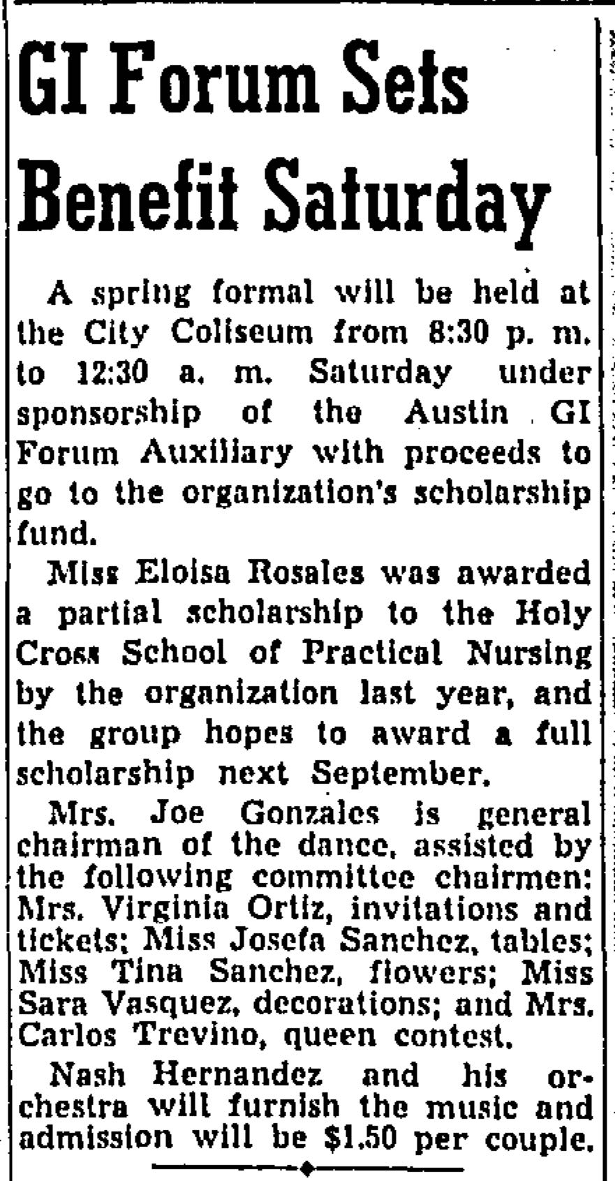 The Nash Hernandez orchestra largely shed their “white” pseudonym, “Jim Nash,” in the aftermath of these powerful legal victories by LULUC and the American G.I. Forum. This refusal to disguise their identity may have been an effect of the successes of the Mexican American Civil Rights movement during this period, a sign of the increasing confidence and public pride in Mexican Americans’ place and status in Texas. Asserting the bands' heritage at mainstream Austin dance venues was a form of cultural work that paralleled LULAC and the American G.I. Forum's activism in the courts.