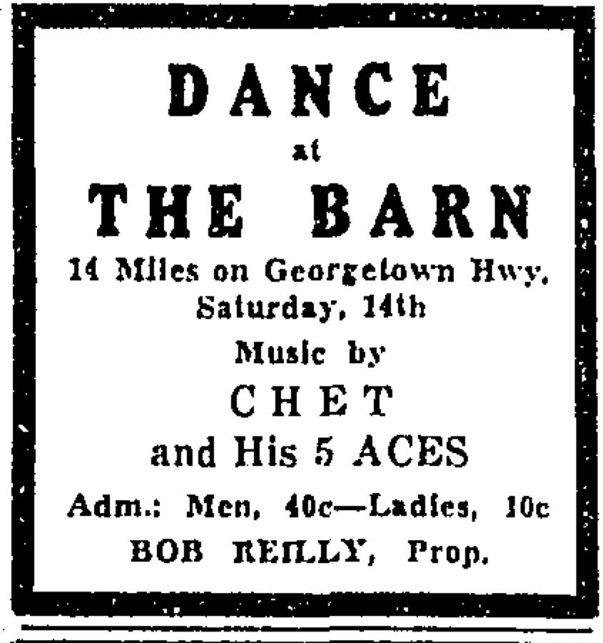The Sunset Tavern opened the same year as the Barn, but records of performances for it are fairly sparse during its early years. “Kittie and Her Kittens,” who played regularly at Dessau Hall and were probably a female-led Hillbilly group, also did Tuesday night gigs there in June 1940. There wasn’t another ad, however, until 1942, when “Grouchy and the Texas Pioneers ” played with Bob Dunn, the most important early innovator on the steel guitar.5