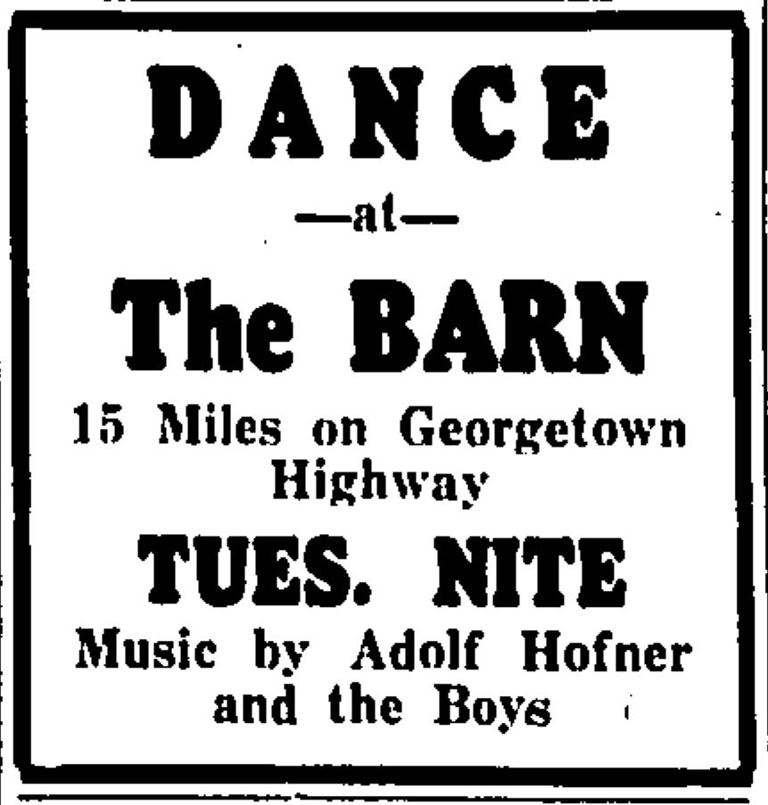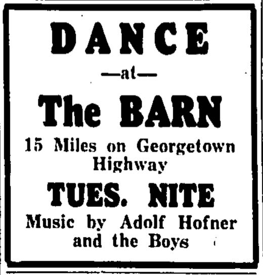 Beginning in 1941, modern Hillbilly and Rural Rhythm bands began to gain a foothold in the Texas capital. It was “The Barn” and “The Sunset Tavern ” that seem to have set in motion the slow but steady growth of the Western Swing presence around Austin. “The Barn,” opened in 1940, was 16 miles north on the Georgetown/Dallas Highway (now North Lamar). It was a re-christening of the “Cocklebur Barn ,” a venue that had hosted probable Western Swing groups like Lee Fariss and his Dixieland Band (with Uncle Walt on steel guitar) in 1938 and 1939.4 The Barn, and its predecessor, built on the regular dances at Dessau Hall by Uncle Walt's Rural Rhythm and the Radio Ranglers during the second half of the 1930s. Dessau was the true progenitor of the local Western Swing scene, but the addition of the Barn ultimately brought in both new acts and multiplied the weekly performances.